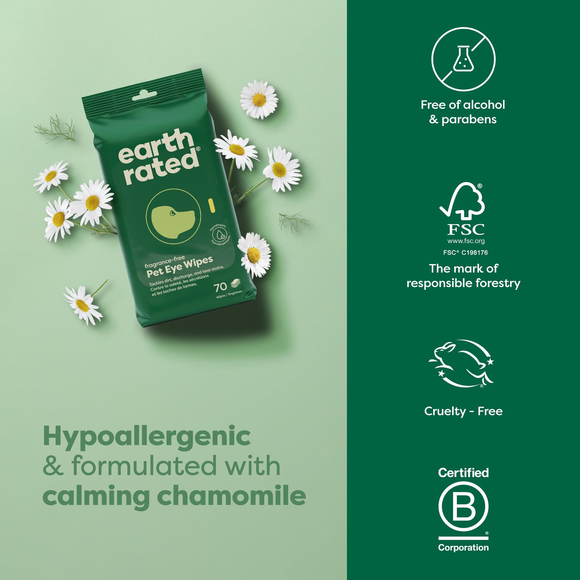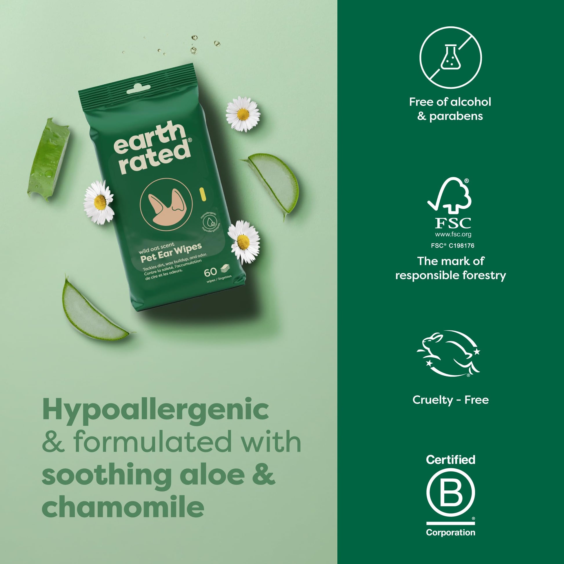 Earth Rated (A Canadian Company) Vet-Developed Pet Ear Wipes, Hypoallergenic Cleaner for Dogs & Cats Ears to Remove Dirt and Wax Build Up, Wild Oat Scent, 70 Count