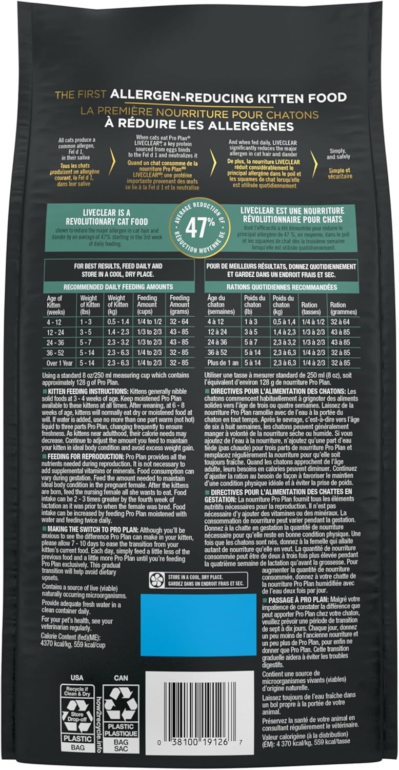 The first kitten formula of its kind, Purina Pro Plan LIVECLEAR Chicken and Rice Formula dry kitten food provides a revolutionary approach for cat allergen management. This allergen-reducing cat food simply and safely neutralizes Fel D 1, a common allergen in cat saliva, through the use of a key protein sourced from eggs. Discovered through over a decade of research, LIVECLEAR was shown to reduce the major allergen in cat hair and dander by an average of 47 percent starting in the third week of daily feeding. With chicken as the first ingredient, this high protein kitten food helps provide the protein your kitten needs for strong muscles, plus cat antioxidants to help support your kitten’s developing immune system. It also includes calcium phosphorus and other minerals to help build strong bones and teeth. Plus, we fortify this allergen-reducing Purina kitten food with guaranteed live probiotics for cats to support digestive and immune health. Try this groundbreaking Purina Pro Plan LIVECLEAR dry food for kittens with probiotics risk-free, and discover the life-changing results allergen reducing cat nutrition can make in your kitten’s life and yours.